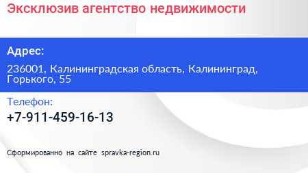 Эксклюзив, агентство недвижимости по адресу 236001, Калининградская область, Калининград, Горького, 55 в дальнейшем Организация, размещена в следующих категориях: