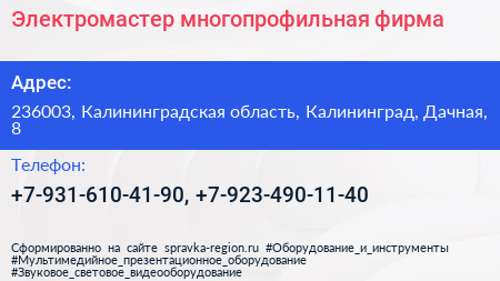 Электромастер, многопрофильная фирма по адресу 236003, Калининградская область, Калининград, Дачная, 8 в дальнейшем Организация, размещена в следующих категориях: