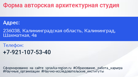 Форма, авторская архитектурная студия по адресу 236038, Калининградская область, Калининград, Шахматная, 4в в дальнейшем Организация, размещена в следующих категориях: