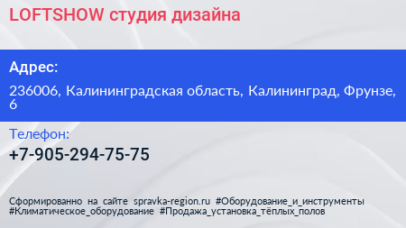 LOFTSHOW, студия дизайна по адресу 236006, Калининградская область, Калининград, Фрунзе, 6 в дальнейшем Организация, размещена в следующих категориях: