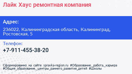 Лайк-Хаус, ремонтная компания по адресу 236022, Калининградская область, Калининград, Ростовская, 5 в дальнейшем Организация, размещена в следующих категориях: