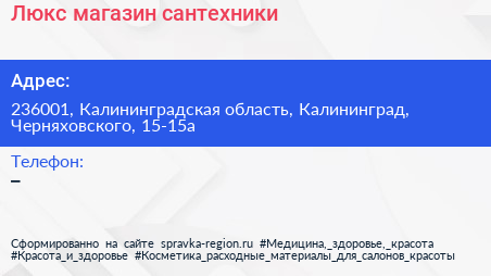 Люкс, магазин сантехники по адресу 236001, Калининградская область, Калининград, Черняховского, 15-15а в дальнейшем Организация, размещена в следующих категориях: