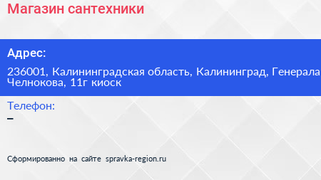 Магазин сантехники по адресу 236001, Калининградская область, Калининград, Генерала Челнокова, 11г киоск в дальнейшем Организация, размещена в следующих категориях: