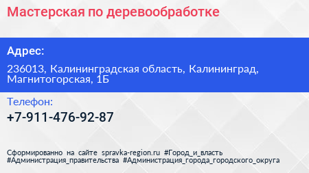Мастерская по деревообработке по адресу 236013, Калининградская область, Калининград, Магнитогорская, 1Б в дальнейшем Организация, размещена в следующих категориях: