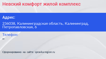 Невский комфорт, жилой комплекс по адресу 236038, Калининградская область, Калининград, Петропавловская, 6 в дальнейшем Организация, размещена в следующих категориях: