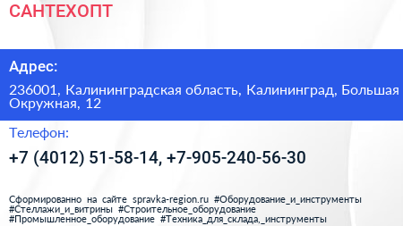 САНТЕХОПТ по адресу 236001, Калининградская область, Калининград, Большая Окружная, 12 в дальнейшем Организация, размещена в следующих категориях: