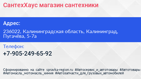 СантехХаус, магазин сантехники по адресу 236022, Калининградская область, Калининград, Пугачёва, 5-7а в дальнейшем Организация, размещена в следующих категориях: