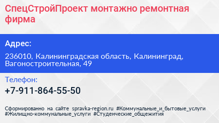 СпецСтройПроект, монтажно-ремонтная фирма по адресу 236010, Калининградская область, Калининград, Вагоностроительная, 49 в дальнейшем Организация, размещена в следующих категориях: