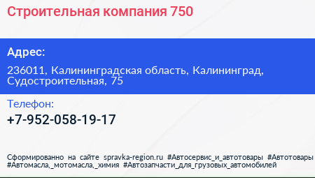 Строительная компания 750 по адресу 236011, Калининградская область, Калининград, Судостроительная, 75 в дальнейшем Организация, размещена в следующих категориях: