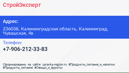 СтройЭксперт по адресу 236038, Калининградская область, Калининград, Чувашская, 4в в дальнейшем Организация, размещена в следующих категориях: