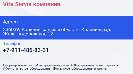 Vita Servis, компания по адресу 236039, Калининградская область, Калининград, Железнодорожная, 12 в дальнейшем Организация, размещена в следующих категориях: