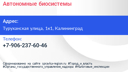 Автономные биосистемы по адресу Туруханская улица, 1к1, Калининград в дальнейшем Организация, размещена в следующих категориях: