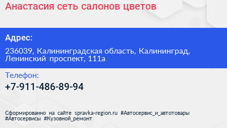 Анастасия, сеть салонов цветов по адресу 236039, Калининградская область, Калининград, Ленинский проспект, 111а в дальнейшем Организация, размещена в следующих категориях: