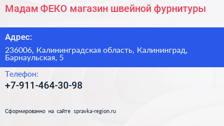 Мадам ФЕКО, магазин швейной фурнитуры по адресу 236006, Калининградская область, Калининград, Барнаульская, 5 в дальнейшем Организация, размещена в следующих категориях:
