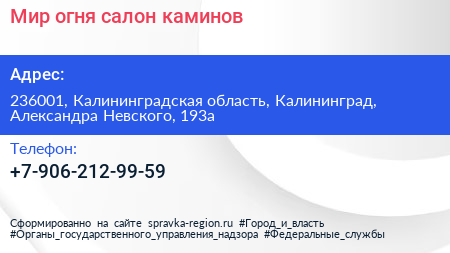 Мир огня, салон каминов по адресу 236001, Калининградская область, Калининград, Александра Невского, 193а в дальнейшем Организация, размещена в следующих категориях: