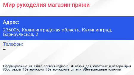 Мир рукоделия, магазин пряжи по адресу 236006, Калининградская область, Калининград, Барнаульская, 2 в дальнейшем Организация, размещена в следующих категориях: