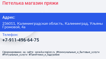 Петелька, магазин пряжи по адресу 236011, Калининградская область, Калининград, Ульяны Громовой, 4а в дальнейшем Организация, размещена в следующих категориях: