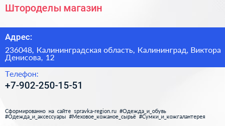 Штороделы, магазин по адресу 236048, Калининградская область, Калининград, Виктора Денисова, 12 в дальнейшем Организация, размещена в следующих категориях: