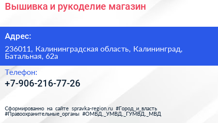 Вышивка и рукоделие, магазин по адресу 236011, Калининградская область, Калининград, Батальная, 62а в дальнейшем Организация, размещена в следующих категориях: