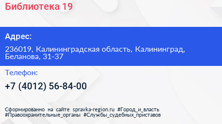 Библиотека №19 по адресу 236019, Калининградская область, Калининград, Беланова, 31-37 в дальнейшем Организация, размещена в следующих категориях: