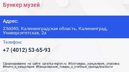 Бункер, музей по адресу 236040, Калининградская область, Калининград, Университетская, 2а в дальнейшем Организация, размещена в следующих категориях: