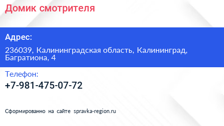Домик смотрителя по адресу 236039, Калининградская область, Калининград, Багратиона, 4 в дальнейшем Организация, размещена в следующих категориях: