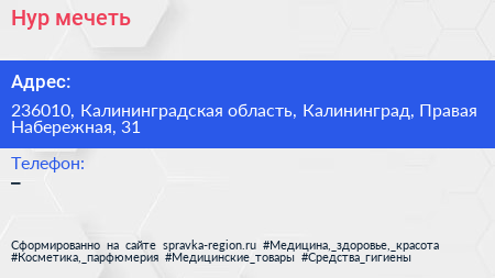 Нур, мечеть по адресу 236010, Калининградская область, Калининград, Правая Набережная, 31 в дальнейшем Организация, размещена в следующих категориях: