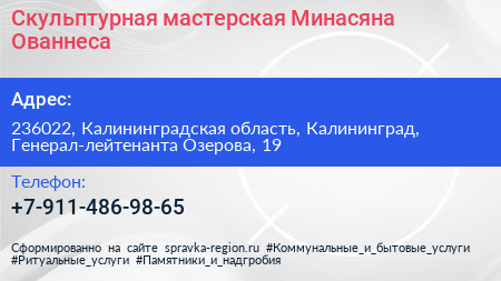 Скульптурная мастерская Минасяна Ованнеса по адресу 236022, Калининградская область, Калининград, Генерал-лейтенанта Озерова, 19 в дальнейшем Организация, размещена в следующих категориях: