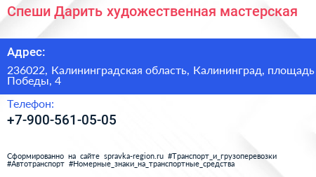 Спеши Дарить, художественная мастерская по адресу 236022, Калининградская область, Калининград, площадь Победы, 4 в дальнейшем Организация, размещена в следующих категориях: