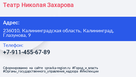 Театр Николая Захарова по адресу 236010, Калининградская область, Калининград, Глазунова, 9 в дальнейшем Организация, размещена в следующих категориях: