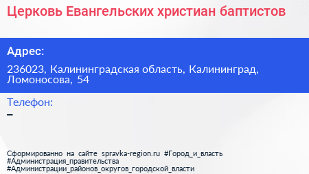 Церковь Евангельских христиан-баптистов по адресу 236023, Калининградская область, Калининград, Ломоносова, 54 в дальнейшем Организация, размещена в следующих категориях: