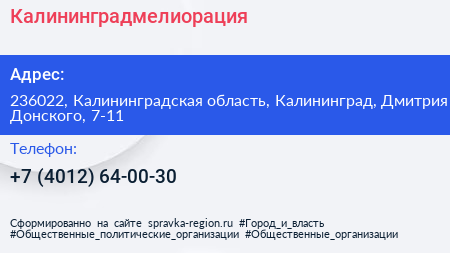 Калининградмелиорация по адресу 236022, Калининградская область, Калининград, Дмитрия Донского, 7-11 в дальнейшем Организация, размещена в следующих категориях: