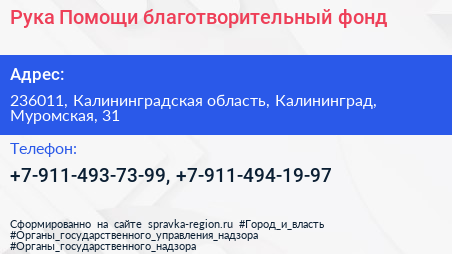 Рука Помощи, благотворительный фонд по адресу 236011, Калининградская область, Калининград, Муромская, 31 в дальнейшем Организация, размещена в следующих категориях: