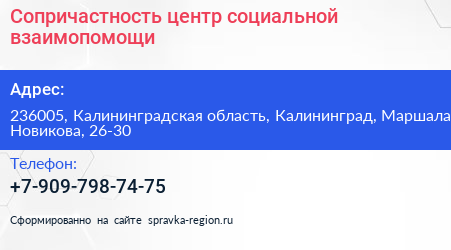 Сопричастность, центр социальной взаимопомощи по адресу 236005, Калининградская область, Калининград, Маршала Новикова, 26-30 в дальнейшем Организация, размещена в следующих категориях:
