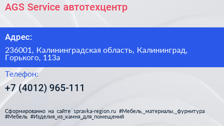 AGS Service, автотехцентр по адресу 236001, Калининградская область, Калининград, Горького, 113а в дальнейшем Организация, размещена в следующих категориях: