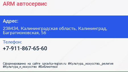 ARM, автосервис по адресу 238434, Калининградская область, Калининград, Багратионовская, 56 в дальнейшем Организация, размещена в следующих категориях: