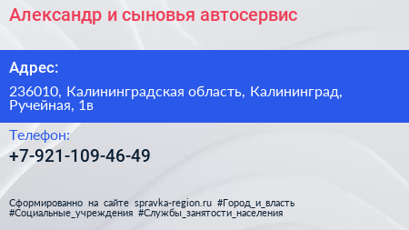 Александр и сыновья, автосервис по адресу 236010, Калининградская область, Калининград, Ручейная, 1в в дальнейшем Организация, размещена в следующих категориях:
