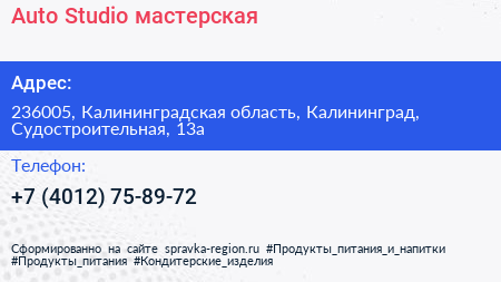Auto Studio, мастерская по адресу 236005, Калининградская область, Калининград, Судостроительная, 13а в дальнейшем Организация, размещена в следующих категориях: