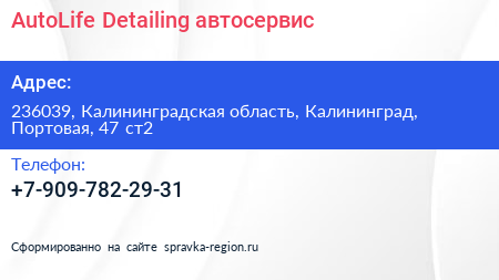 AutoLife Detailing, автосервис по адресу 236039, Калининградская область, Калининград, Портовая, 47 ст2 в дальнейшем Организация, размещена в следующих категориях: