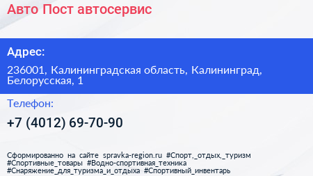 Авто Пост, автосервис по адресу 236001, Калининградская область, Калининград, Белорусская, 1 в дальнейшем Организация, размещена в следующих категориях: