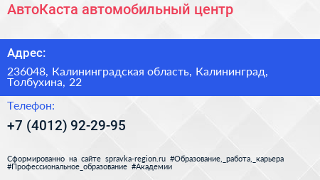 АвтоКаста, автомобильный центр по адресу 236048, Калининградская область, Калининград, Толбухина, 22 в дальнейшем Организация, размещена в следующих категориях: