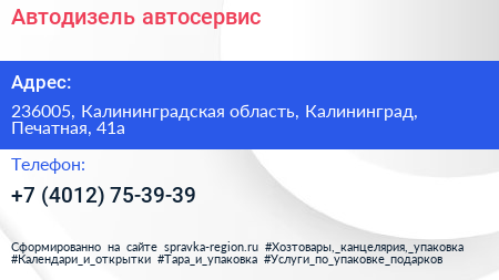 Автодизель, автосервис по адресу 236005, Калининградская область, Калининград, Печатная, 41а в дальнейшем Организация, размещена в следующих категориях: