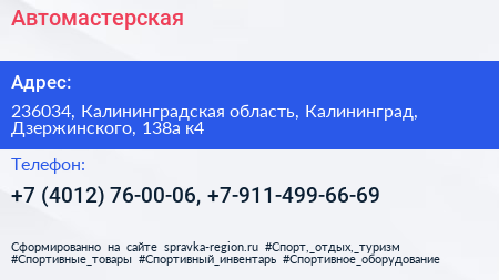 Автомастерская по адресу 236034, Калининградская область, Калининград, Дзержинского, 138а к4 в дальнейшем Организация, размещена в следующих категориях:
