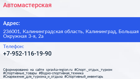 Автомастерская по адресу 236001, Калининградская область, Калининград, Большая Окружная 3-я, 2а в дальнейшем Организация, размещена в следующих категориях: