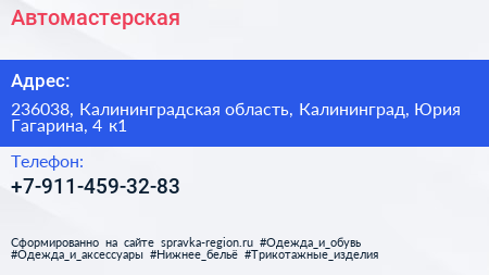Автомастерская по адресу 236038, Калининградская область, Калининград, Юрия Гагарина, 4 к1 в дальнейшем Организация, размещена в следующих категориях: