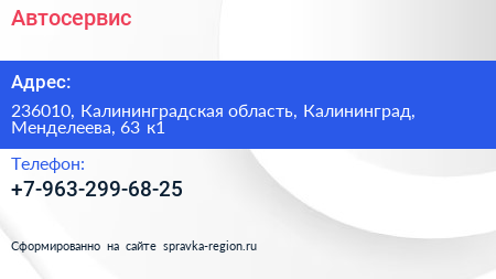 Автосервис по адресу 236010, Калининградская область, Калининград, Менделеева, 63 к1 в дальнейшем Организация, размещена в следующих категориях: