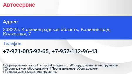 Автосервис по адресу 238225, Калининградская область, Калининград, Колхозная, 7 в дальнейшем Организация, размещена в следующих категориях: