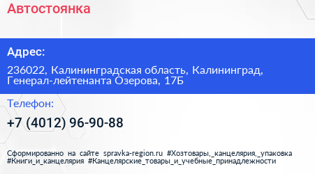 Для связи с организацией воспользуйтесь номером телефона: +7 (4012) 96-90-88. Пн: c 09:00-17:00, Вт: c 09:00-17:00, Ср: c 09:00-17:00, Чт: c 09:00-17:00, Пт: c 09:00-17:00, Сб: выходной, Вс: выходной. автостоянка: пн-вс круглосуточно, вы можете обратиться в эту организацию.
