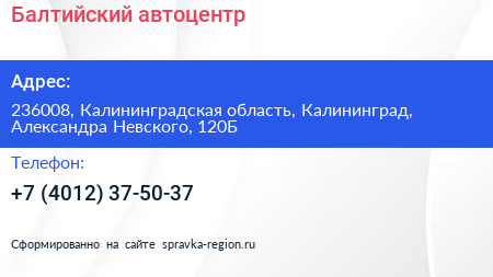 Балтийский, автоцентр по адресу 236008, Калининградская область, Калининград, Александра Невского, 120Б в дальнейшем Организация, размещена в следующих категориях: