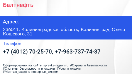 Балтнефть по адресу 236011, Калининградская область, Калининград, Олега Кошевого, 31 в дальнейшем Организация, размещена в следующих категориях: